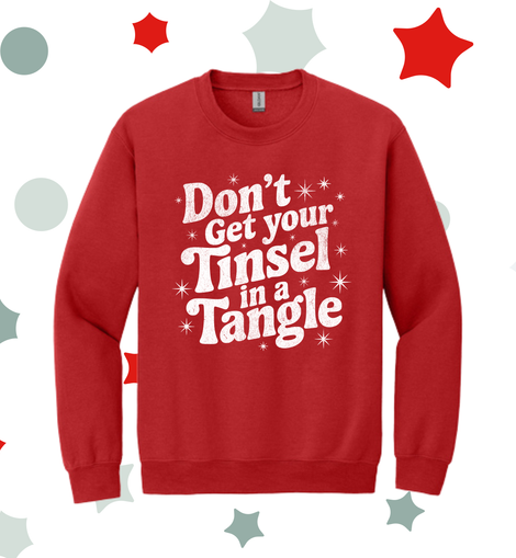 Don't Get Your Tinsel in a Tangle Sweatshirt Wrap yourself in holiday humor with this playful red sweatshirt featuring bold white lettering. Perfect for anyone who appreciates a good laugh during the festive season, this cozy layer keeps the spirit light and witty. Whether you're navigating holiday chaos or just want to share a smile, this tee delivers comfort and personality in one cheerful package.